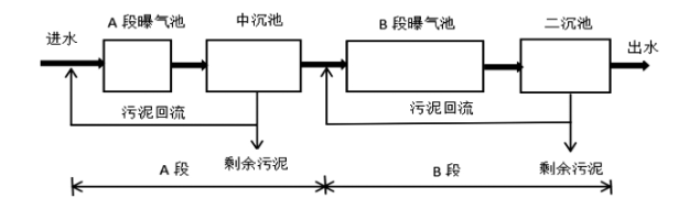 AB工藝是一種包括A段(吸附段)和B段(生物氧化段)的兩段活性污泥法,其工藝流程如下圖所示。此流程由A段曝氣池、中沉池、B段曝氣池和二沉池四部分組成。A段與B段的污泥回流互不影響,各自有各自的體系,相互獨立。為了使原污水中存在的微生物和有機物得以充分利用,A段之前一般不設(shè)初沉池,保障系統(tǒng)高效穩(wěn)定地運行。在實際工程中,AB工藝是一種處理系統(tǒng),它由城市排水管網(wǎng)和污水處理廠構(gòu)成,因此AB工藝前不設(shè)置初沉池。HDF11cOM